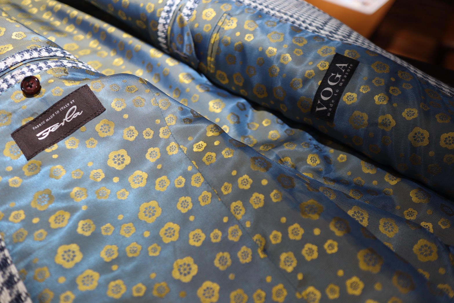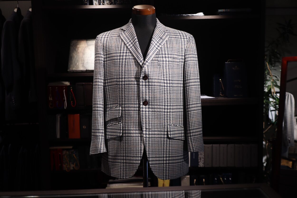 イタリアの名門ファブリックメーカー FERLA(フェルラ) の生地を使用したグレンチェックジャケットはそんな「伝統的な柄」を、現代的に着るための一着としてお仕立ていたしました。